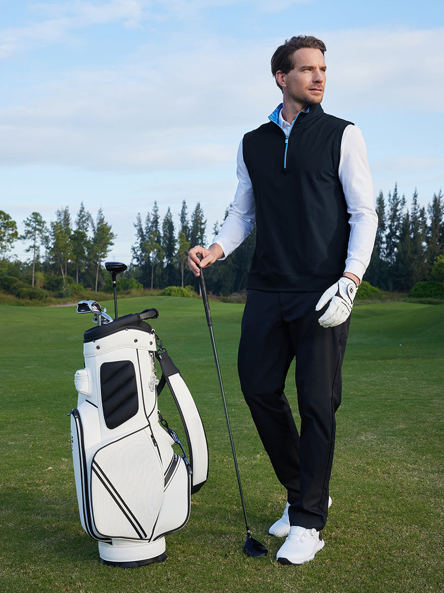 Elevate your golf game with our Print Collar Quarter Zip Golf Vest. Featuring a windproof flap and chic prints inside the collar for a touch of elegance, stand out on the course. The 1/4 zip allows custom breathability, keeping you dry all day. Crafted with high-performance 4-way stretch fabric, it's breathable, moisture-wicking, soft, lightweight, and quick-drying for ultimate comfort and flexibility.