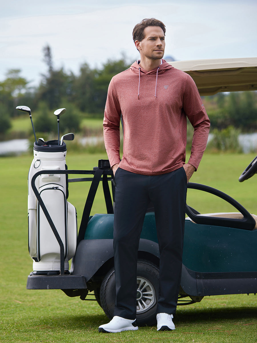 Embrace comfort with our "Classic Heather Fleece Hoodies" for men. Crafted from polyester fleece-lined fabric, these hoodies offer lightweight warmth, easy care, UPF+ protection, a soft hand-feel, breathability, and stretch. Stay warm and cozy both on and off the course in style, enhanced with reflective stripes for nighttime visibility and safety.